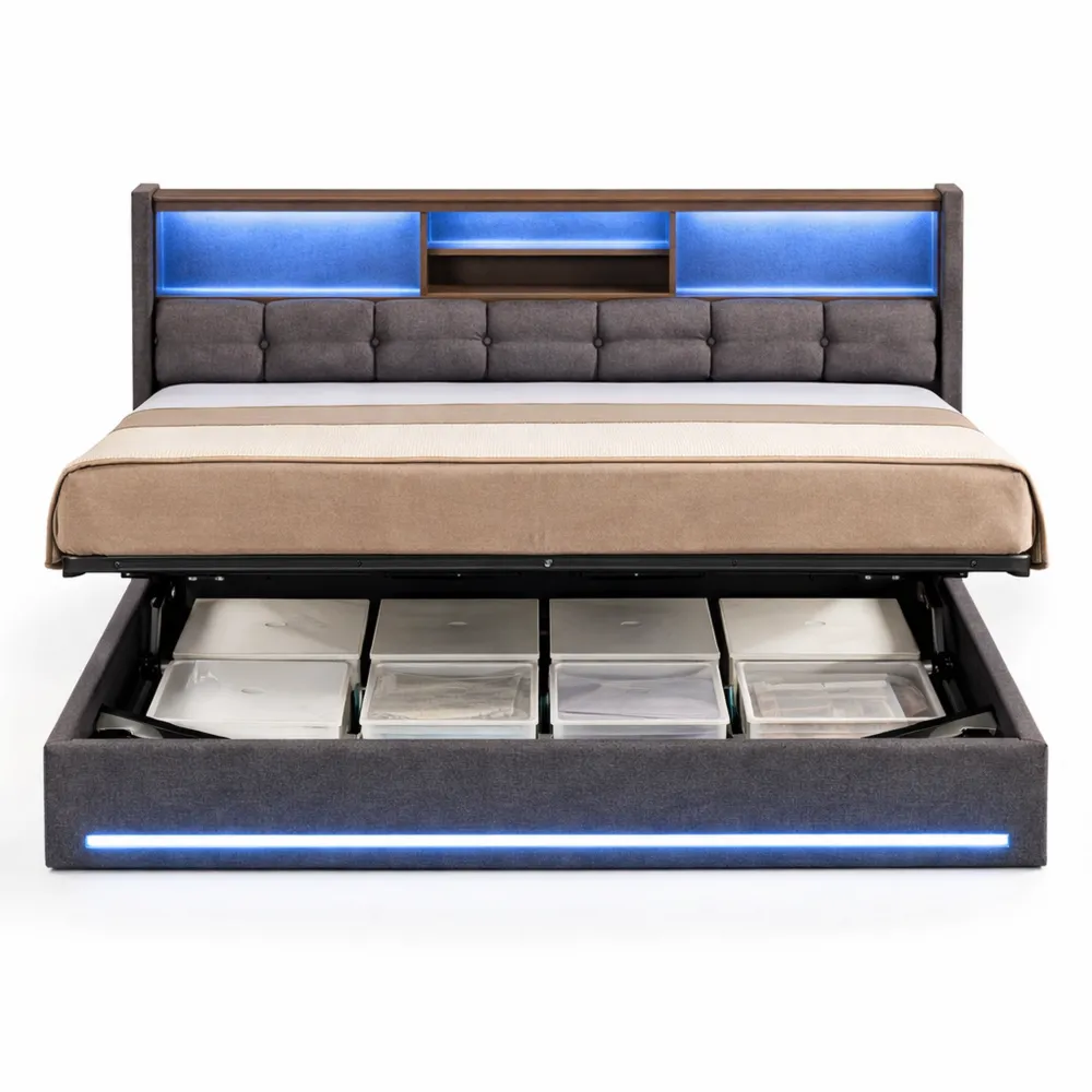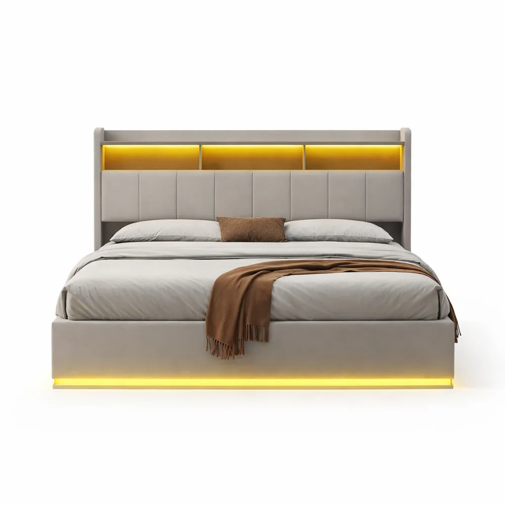 Lit Double avec Rangement LED et Port USB, Tête Capitonnée et Étagères Ouvertes, Sommier Hydraulique