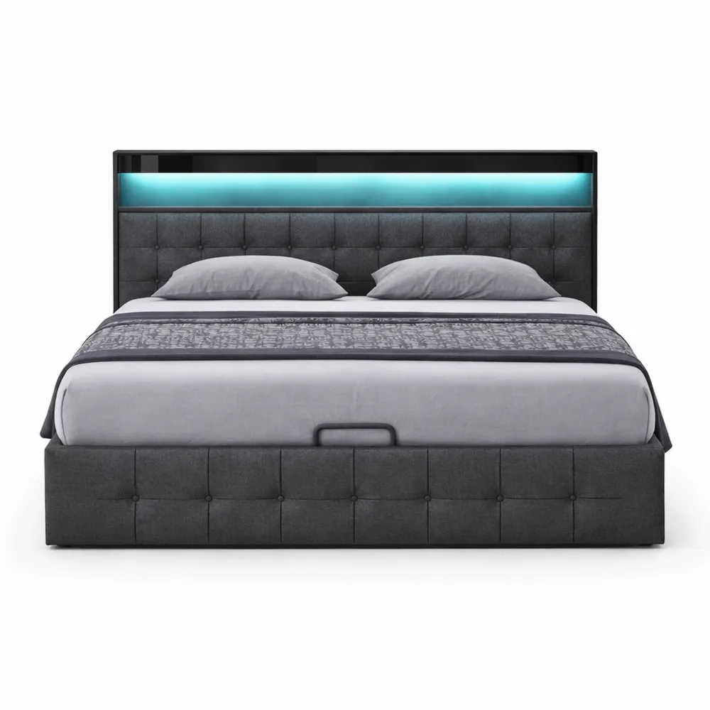 Lit Double Rembourré 140x190 cm avec LED et Ports USB, Rangement Hydraulique, Tête de Lit Réglable, Sommier à Lattes, Facile à Assembler, Gris Foncé
