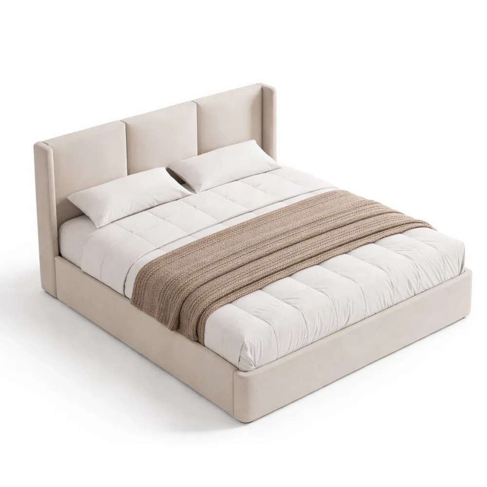 Lit Double Velours Beige avec Rangement et Liseuses LED