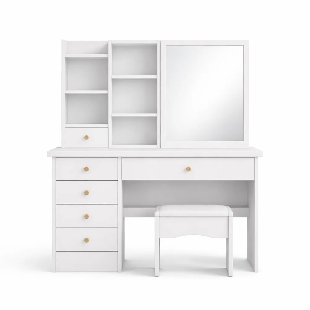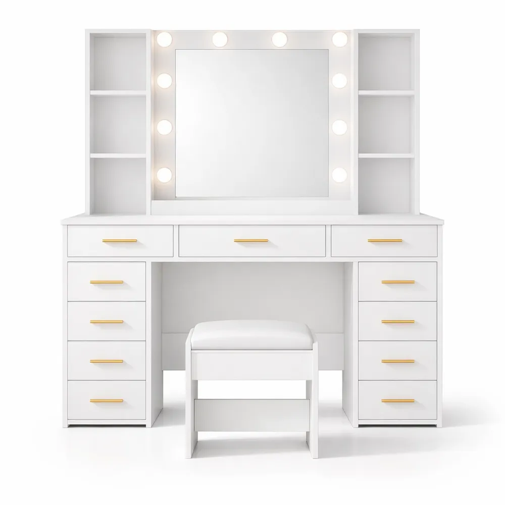 Coiffeuse Moderne avec LED et Tabouret, 11 Tiroirs, Prise de Courant, Rangement à 6 Étagères