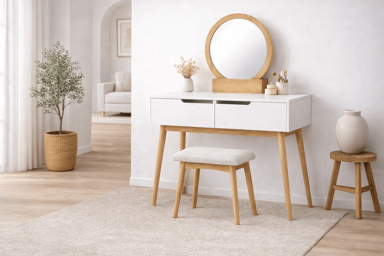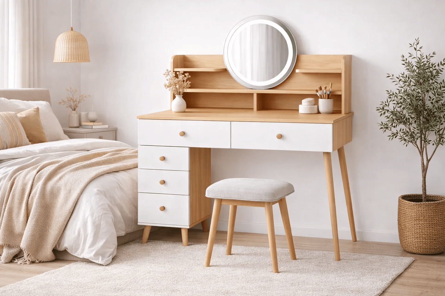 Table de maquillage avec miroir LED intégré et plusieurs espaces de rangement. Structure en panneaux bois avec tiroirs et étagères pour organiser les accessoires.