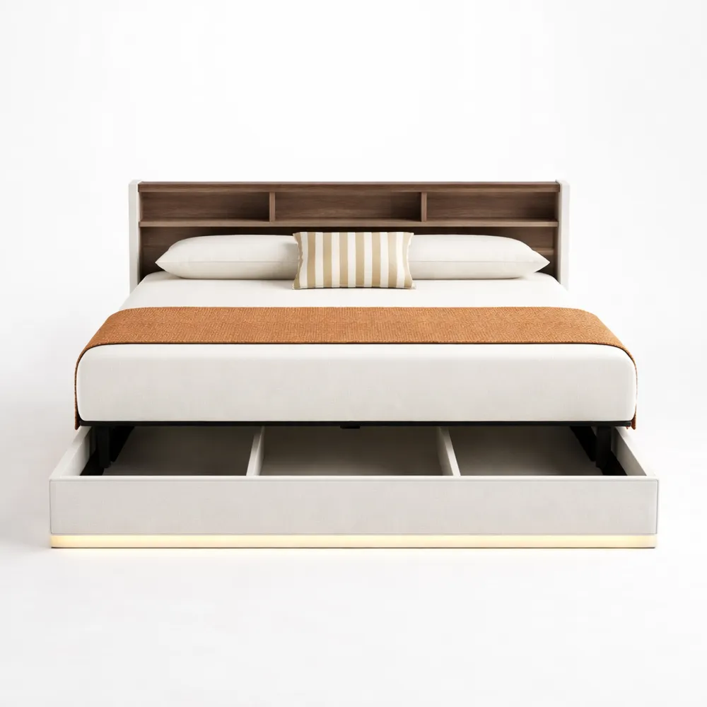 Ce lit avec rangement offre un espace fonctionnel avec un panneau de tête pliant et des étagères ouvertes pour ranger divers objets comme des livres et des réveils. Un espace de rangement sous le lit, accessible par un système hydraulique, permet de stocker des articles saisonniers. Le lit est équipé de prises de chargement pour appareils électroniques et de bandeaux LED réglables pour l'éclairage nocturne. Le cadre de 140x200 cm, avec ses lamelles en bois et son cadre métallique, assure un soutien solide. Des poches latérales et des étagères avec rebords sont intégrées pour un rangement pratique. Le matériau utilisé est résistant et durable, s'intégrant à divers intérieurs.