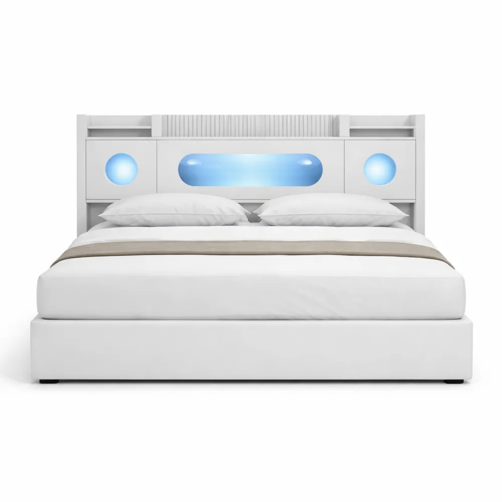 Cette literie présente un design au style moderne dans des tons crème en velours. Elle comprend une bande LED intégrée à la tête de lit pour une ambiance lumineuse douce. Un système de rangement à gaz est disponible sous le lit pour faciliter le rangement des objets. La tête de lit et les côtés sont recouverts de velours, offrant une sensation de douceur et de confort. Sa structure en acier assure une bonne stabilité. Détails du produit : Dimensions (L x l x H) : 221 x 166/146 x 95.5 cm Matériau : Velours + bois + métal Couleur : Beige Matelas compatibles (sans matelas) : 140/160/180 x 200 cm Chargement : USB, Type-C Sommier requis : Non Charge maximale : 300 kg Inclus : Cadre de lit, USB et éclairage LED Caractéristiques : Fonction de chargement/éclairage LED, tête de lit réglable Nombre de lattes : 12 Inclus : 1 lit capitonné 1 manuel d'utilisation