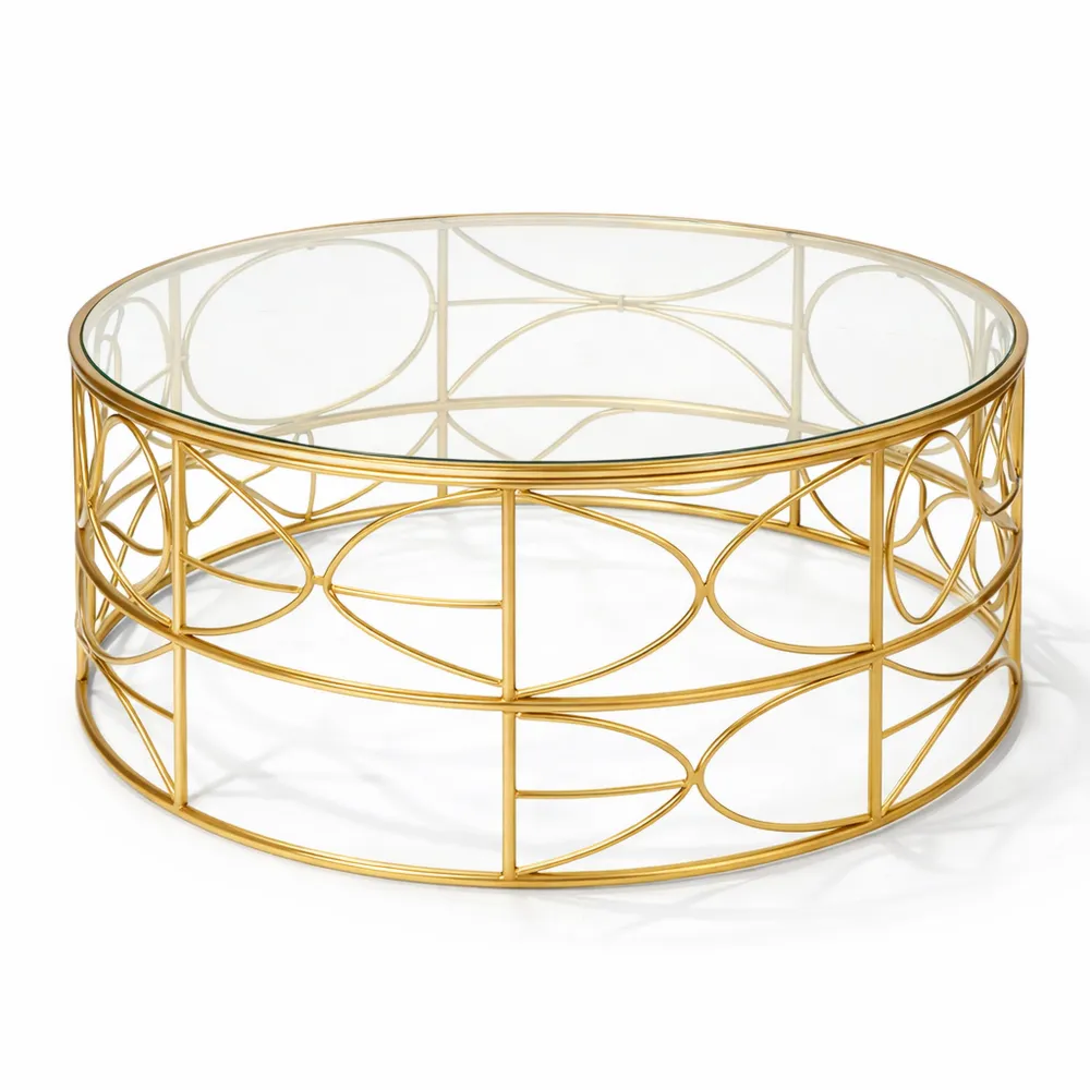 Son piètement en fer doré aux motifs géométriques et son plateau transparent ajoutent un style distinctif à votre salon.