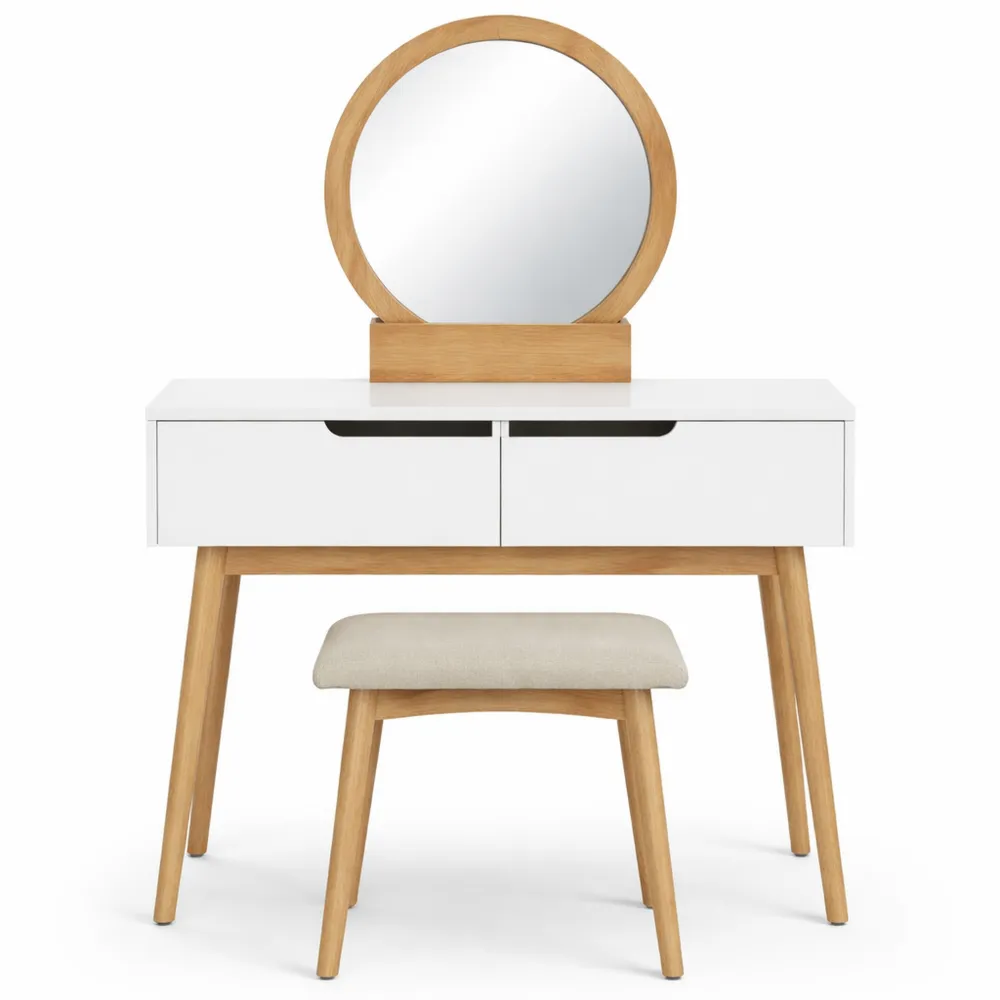 Coiffeuse design scandinave avec pieds effilés pour une intégration dans votre chambre ou dressing. Miroir rond pour une touche de raffinement.